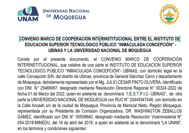 FIRMANDO CONVENIO MARCO DE COOPERACIÓN INTERINSTITUCIONAL ENTRE EL INSTITUTO DE EDUCACIÓN SUPERIOR TECNOLÓGICO PÚBLICO “INMACULADA CONCEPCIÓN”